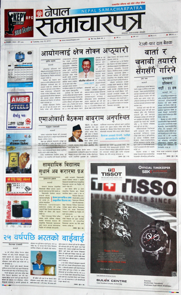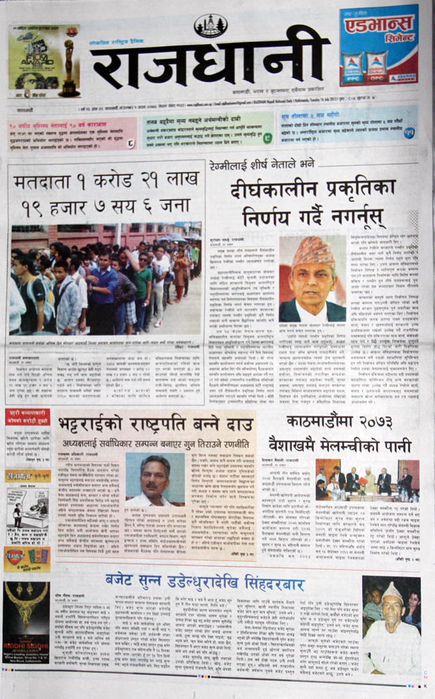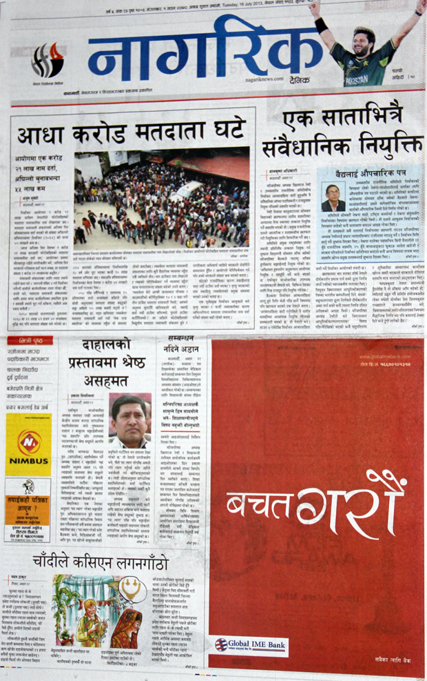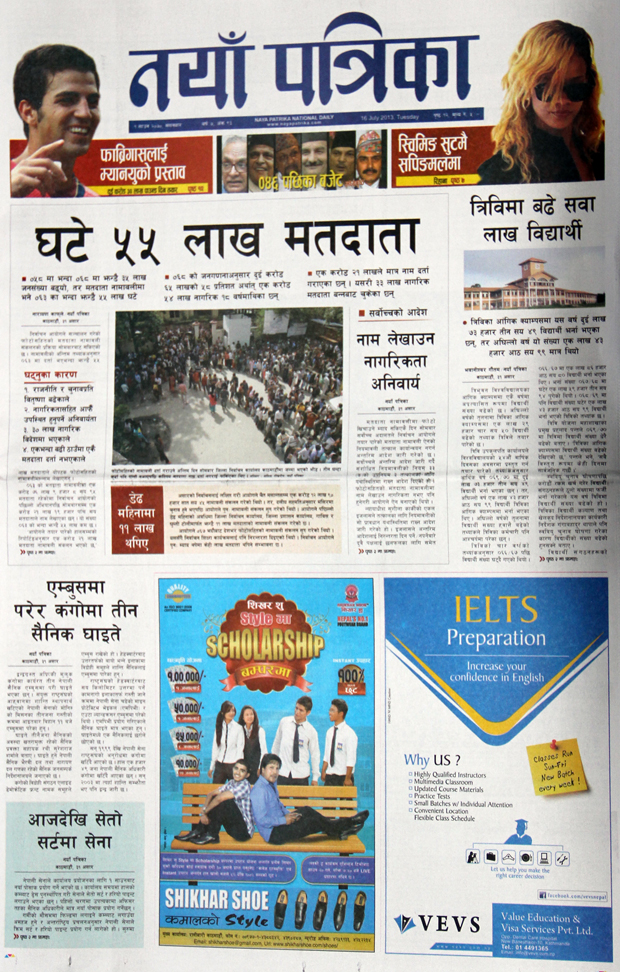 आज मिति २०७० साउन १ गते मंगलबार । राजधानीबाट प्रकाशित आजका दैनिक पत्रिकाले आधा करोड मतदाता घटेको खबरलाई प्राथमिकताका साथ छापेका छन् ।