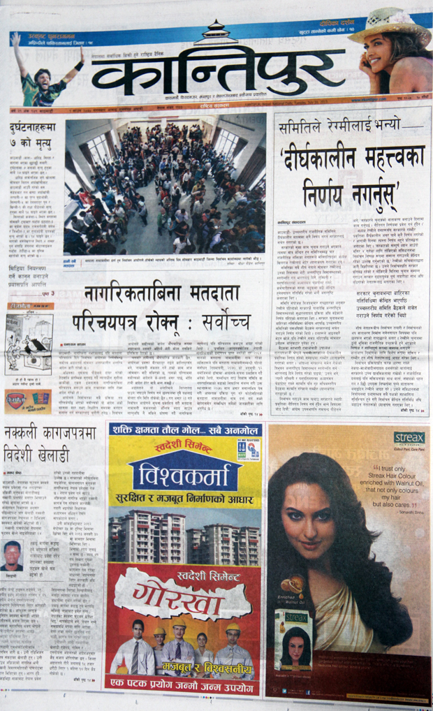 कान्तिपुर दैनिकले नागरिकता बिना मतदाता परिचयपत्र रोक्न दिएको आदेशलाई मुख्य रुपमा छापेको छ । नागरिक दैनिकले एक साताभित्रै संवैधानिक नियुक्ति हुने खबरलाई मुख्य बनाएको छ ।
